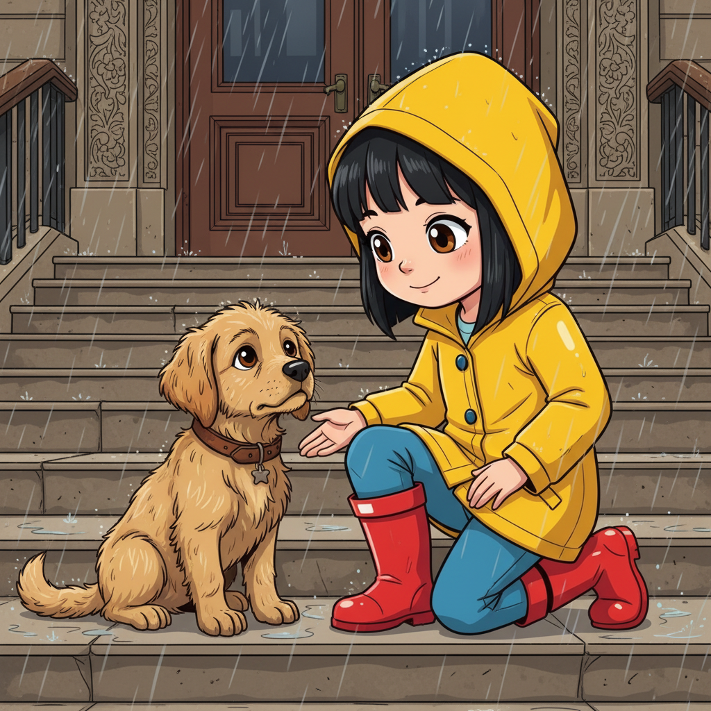 A ten-year-old East Asian girl with a kind heart and a determined spirit. She has shoulder-length straight black hair, brown eyes, and fair skin. She's dressed for a rainy day in a bright yellow rain jacket, blue jeans, and red rubber boots.