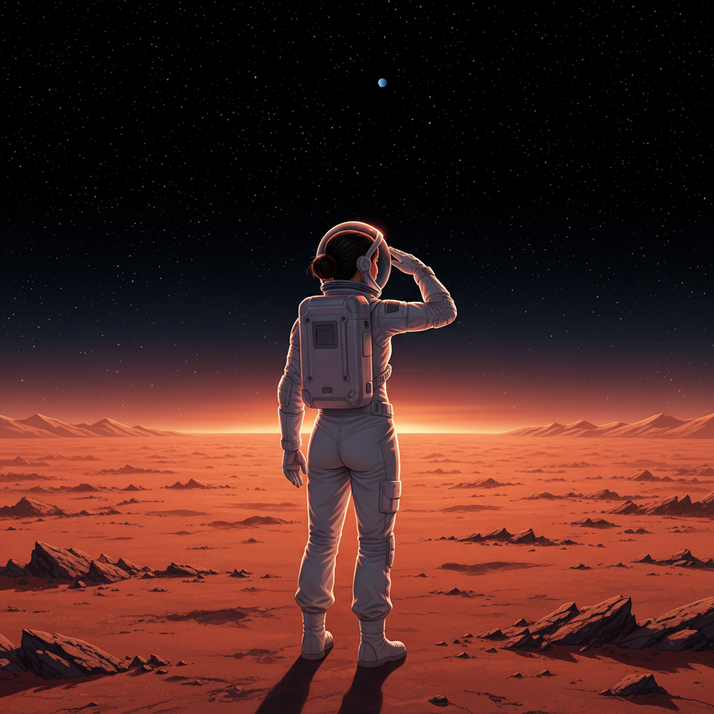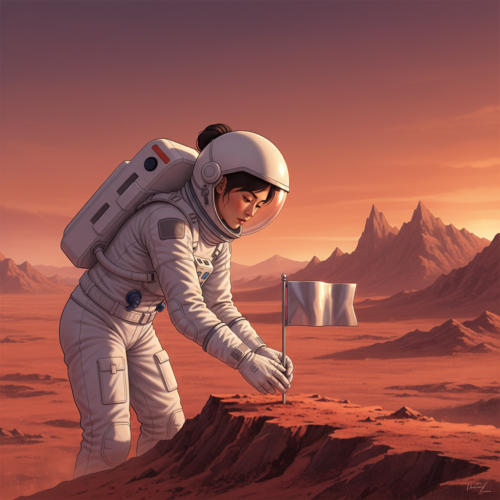 Commander Anya Sharma, a driven and resilient East Asian astronaut in her thirties, the first human to plant a flag on the Martian surface. Her quiet strength belies the enormity of her mission.