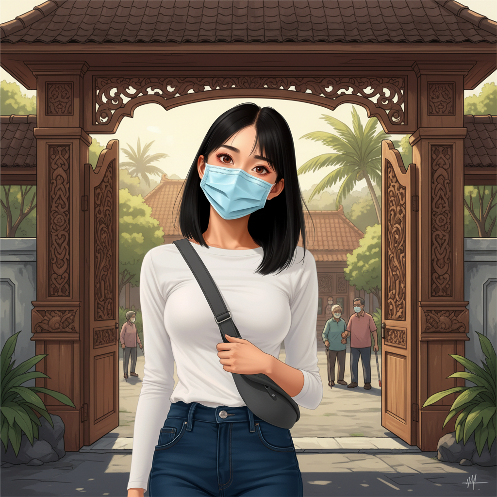 Seorang wanita muda Asia Timur berusia pertengahan 20-an, berambut hitam lurus sebahu, bermata cokelat, berkulit cerah, bertubuh langsing, tinggi rata-rata. Ia mengenakan masker kain biru muda sederhana, kemeja putih lengan panjang pas badan, celana jins biru gelap, dan tas selempang abu-abu di tubuhnya.