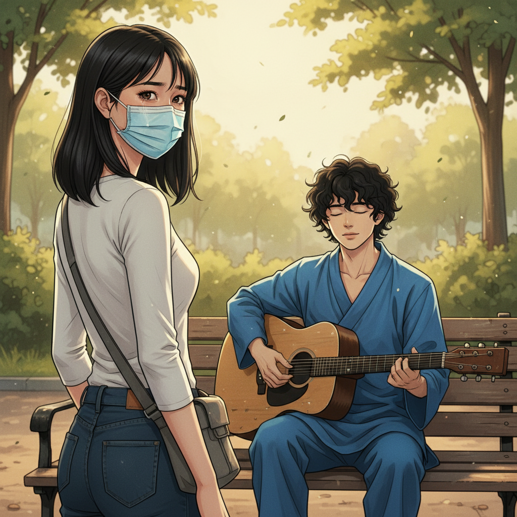 Seorang pria muda Asia Timur berusia pertengahan 20-an, berambut hitam keriting menutupi dahinya, bermata cokelat lembut (buta), berkulit cerah, bertubuh ramping, tinggi rata-rata. Ia mengenakan jubah biru cerah lengan panjang dan memegang gitar akustik.